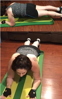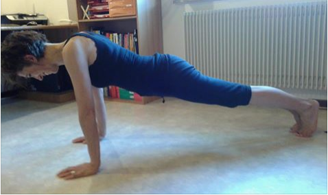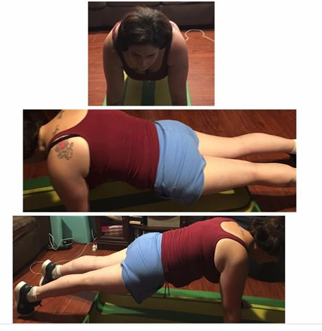 Start on your stomach and push up with your hands below your shoulders, back straight, and your head and neck in a neutral position. Keep your shoulders directly over the elbows. You’re your elbows up with your middle fingers. Squeeze the butt and thighs together to engage your muscles.