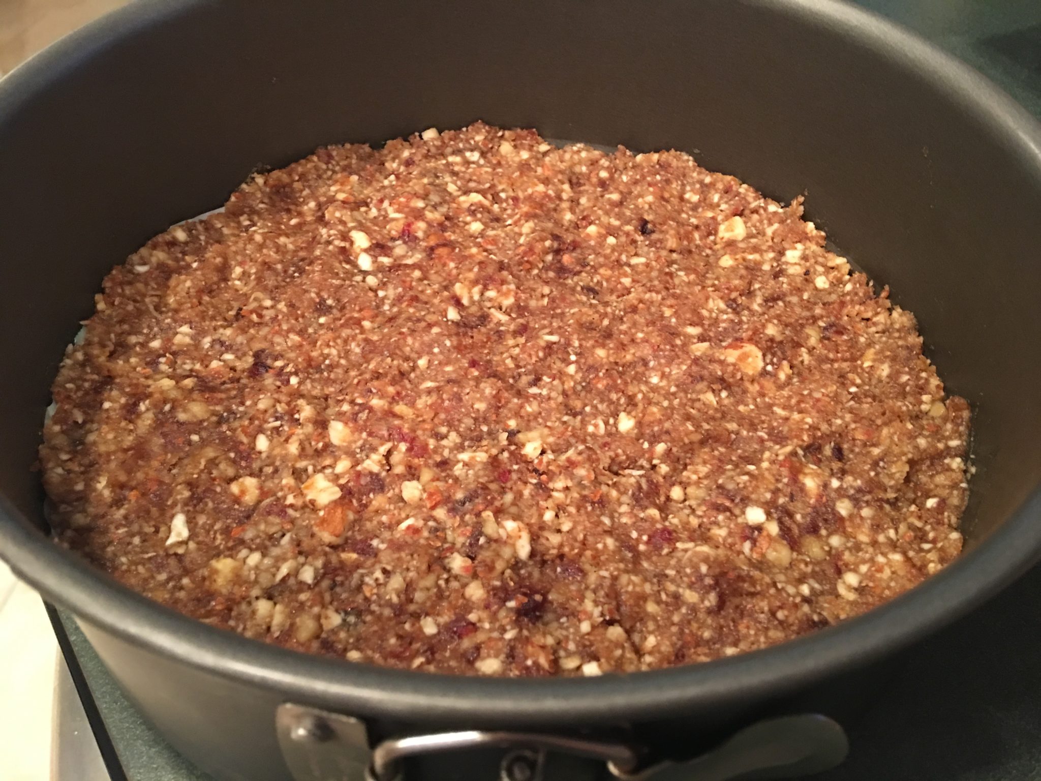 Soak the nuts in a glass mason jar overnight. Pulse the ingredients in a food processor. Spread the ingredients in a springform pan to create the crust.